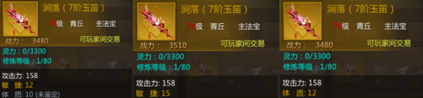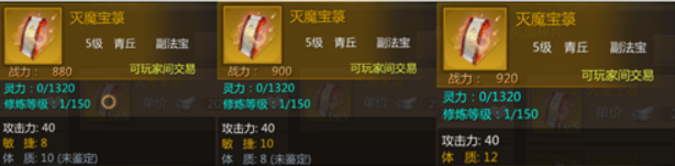 副法宝也依旧是双属性要好于单属性,而双属性中又分了高敏捷和高体质的两个版本,偏向于生存类的副法宝例如玉页金简就选高体质的,偏向于输出类的副法宝例如七宝瓶就选高敏捷的。