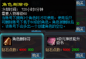 4.对于已经创建三个角色的玩家可以在商城中购买【角色删除符】,可以删除账号下等级低于60级的角色,角色被删除后该账号下就会多出一个创建角色的空位。