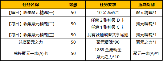 玩家在NPC神灵管理员处,通过3个每日任务收集聚元精魄,90个聚元精魄兑换1个聚元之力,10个聚元之力兑换1个绑定的1级聚元一击(A)卡