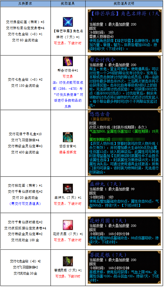 活动期间,NPC“藏宝阁阁主”处将上架以下道具可供兑换: