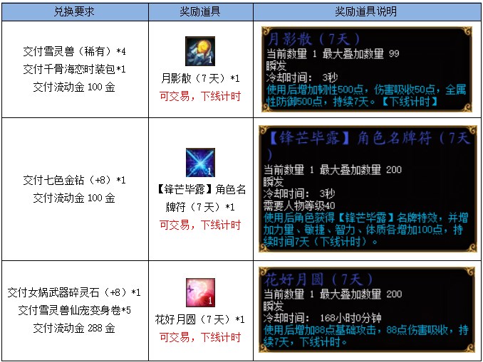 4、本次活动所有兑换道具将在活动结束后在兑换列表里下架,请有需要的玩家抓紧时间兑换。