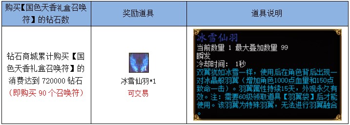 活动期间,单个角色在钻石商城累计购买【国色天香礼盒召唤符】达到指定要求的钻石数量后可获得活动奖励,但每档奖励只能获得1次