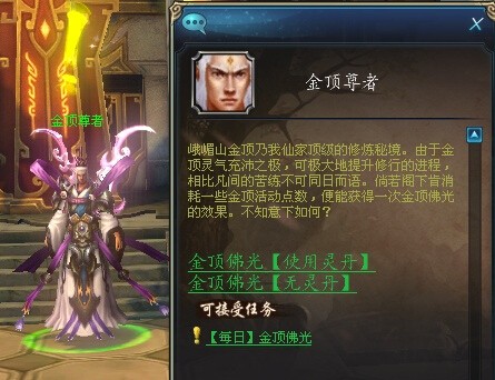 2)玩家可至成都城(坐标:330,-616)及其他城镇对话NPC“金顶尊者”,如下图,可选择使用道具【金顶灵丹】或不使用道具两种方式来消耗金顶点数。