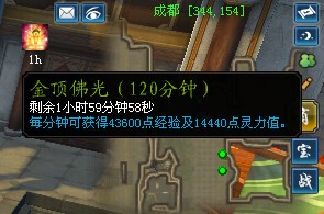 4)勾选完毕后,点击确定,如选取600(120分钟)可获得如下BUFF效果。金顶佛光效果不受任何道具的经验灵力加成也不受服务器多倍经验灵力影响,且离线后不计效果时间。