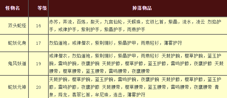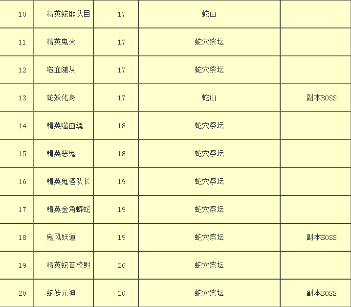 怪物特性: 蛇妖元神每减少25%血会出现2个分身,3个BOSS会同时出现在3处,3个BOSS的血都一样,为元神当前的血量,攻击力类似,假身的防御较低,容易被打死,只有打死真身才会结束BOSS战