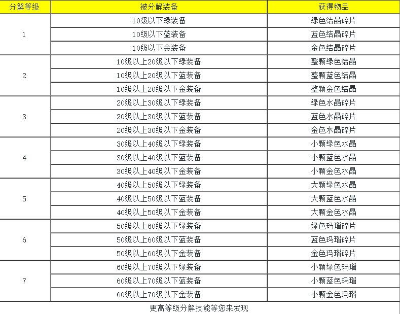 “装备分解”——是指分解掉一些没用的高品质装备后,玩家获得可以制作魔石的各种材料与晶石。等级越高,品质越好的装备分解后获得的结晶等级越高。越高级的魔石制作的时候需要的结晶等级也越高,绑定的装备无法分解,包括灵魂锁定的装备。