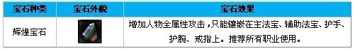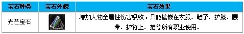 宛若七色水晶的特殊宝石,镶嵌后增加人物全属性伤害吸收,只能镶嵌在衣服、鞋子、护膝、腰带、护符上。