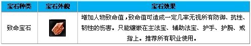 增加人物致命值,只能镶嵌在主法宝、辅助法宝、护手、护腕、戒指上。