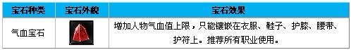 增加人物气血上限,只能镶嵌在衣服、鞋子、护膝、腰带、护符上。