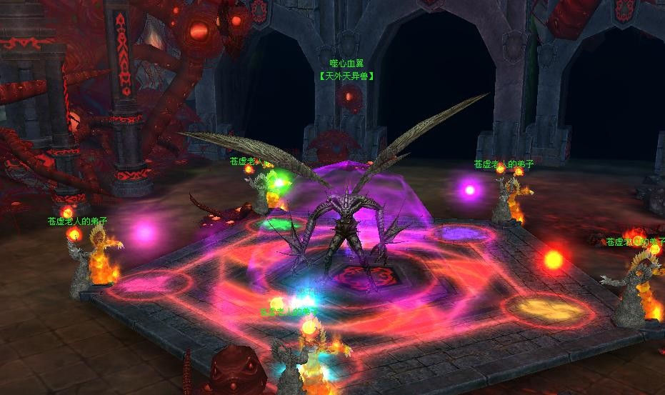 BOSS异兽,78级,被封印成雕像,其周围有5个苍虚老人弟子,玩家进入BOSS房间后5个弟子的元神出来和玩家战斗,玩家每杀死一个元神,对应的 npc变雕像解除一层封印,5个都死亡后boss出场。此Boss也是当血量低于一定百分比时出现邪教小兵前来攻击boss。邪教小兵对boss进行攻击 后就会自我混乱一次(乱跑)。Boss每隔一段时间将邪教小兵变为雕像,10秒后引爆雕像,爆炸范围内的玩家受到伤害并会得到一个减少攻防的有害 buff。若玩家主动引爆可攻击的石雕则,石雕爆炸范围内的玩家会解除该buff,获得一个加攻击的buff。