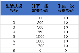 目前,采集技能等级的最高上限为8级,每采集一次便可获得相应的经验值,达到一定经验要求后技能等级就会提升
