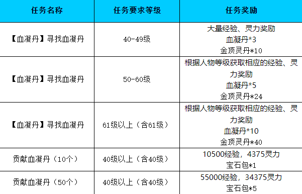 5.玩家收集到足够的血凝丹,可在NPC【醉道人】处完成另外2个任务【贡献血凝丹(10个)】和【贡献血凝丹(50个)】,具体活动奖励见下表:
